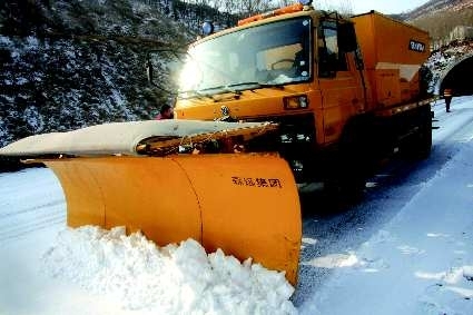 14日上午,青莱高速公路临沂段青岛方向202KM+500M处工作人员正在清理积雪。