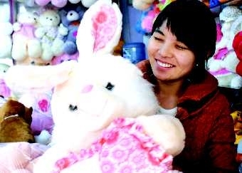 距离农历兔年还有近两个月的时间,兔子造型的头饰、手机链、毛绒玩具等商品开始热销。图为临沂小商品批发市场,一商户正在展示兔子造型的毛绒玩具。 记者 马峰 海蒙 摄
