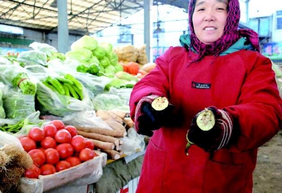 菜商王女士掰开冻坏的茄子,心疼不已。本报见习记者 郑美芹 摄