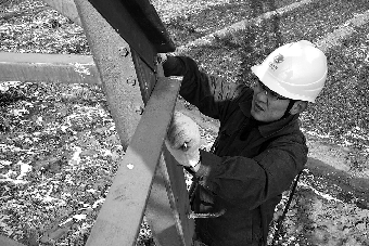 14日,济宁气温骤降,为了确保输电线路安全稳定运行,济宁供电公司输电工区加强了线路巡视力度。图为该公司输电工区线路运行人员在220千伏罗宿线巡视。 本报记者刘守善 本报通讯员魏司法 摄