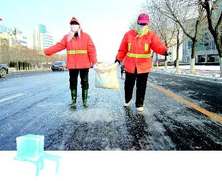 14日下午3时许,记者在东城府前大街看到,两名环卫工人正在向路面撒融雪剂除雪。据环卫工人介绍,她们上午7时许开始清扫残雪,下午2时许向已结冰的路段撒融雪剂加速冰层融化,以方便市民出行。