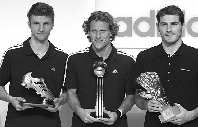当地时间12月14日,世界杯金球奖得主乌拉圭球员弗兰(中)、金手套奖得主西班牙球员卡西利亚斯(右)与金靴奖得主德国球员穆勒合影。世界杯中表现出色的英雄们,在德国赫佐捧起了象征荣耀的奖杯。 新华社 供图