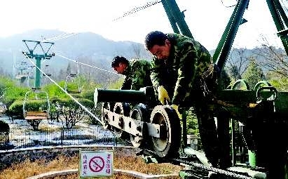 12月15日,千佛山公园,工人们对登山索道进行建成运行十几年来最大规模的检修,除了对支架、电机、减速机、液压站等例行全面检修外,还全面更换了新的吊篮坐椅木面。 本报记者 周青先 通讯员 郭冰 摄