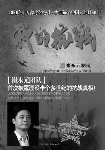 崔永元自筹巨资拍摄的大型电视纪录片《我的抗战》,于11月在全国85家电视台同步播出,其同名图书《我的抗战》也已出版。据悉,该纪录片是崔永元团队历时8年、耗资1.3亿元精心完成的一部口述抗战史记,共采访3500人,集成影像200万分钟,搜集老照片300万张。