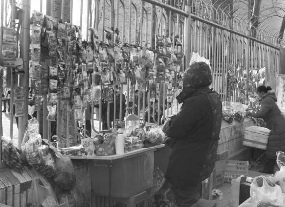 15日下午,实验中学操场西南侧,几个卖零食的小商贩把东西绑在护栏上卖,生意红火,一群学生围着买零食。 本报记者 邹俊美 摄