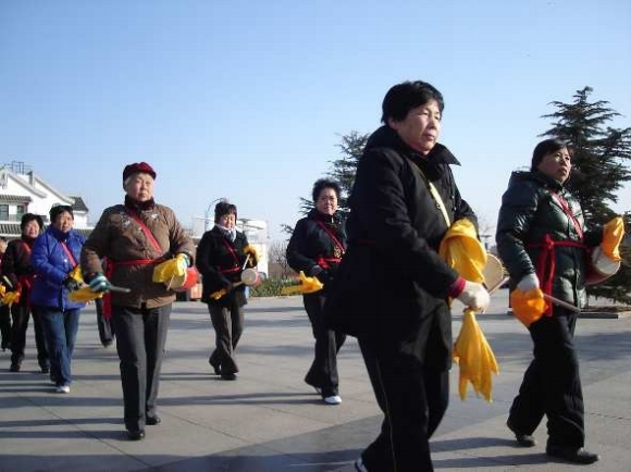 15日下午,古城社区巾帼艺术团的十几名老太太在运河畔的一个广场上打腰鼓,跳竹板秧歌。老人们说,虽然天气冷,但是跳着跳着身子就暖和了。