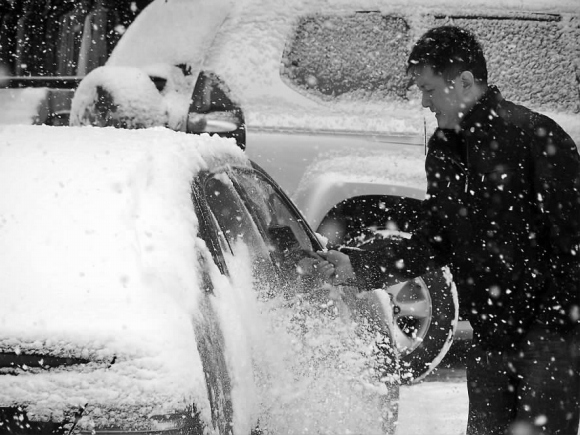 15日中午,威海城区青岛海港路一服装商场外,一车主用毛刷清理车体的覆雪。当天威海暴雪,加上气温很低,厚厚的积雪和结冰导致很多车主不得不弃车而行。