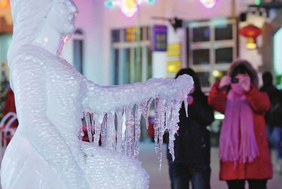 气温骤降,15日,在青岛天幕城,浴女喷泉内的汉白玉雕塑结满“冰挂”,成了一个不折不扣的“冰美人”,晶莹剔透的“冰挂”成了放学回家孩子们眼中的“新玩意”,给这个寒冬注入了无穷乐趣。