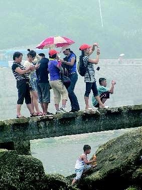 拍摄地点:烟台月亮湾景区作品描述:当日景区内人流如织,石桥上七位游客忙着给亲友拍照留念,而一位小朋友悠闲地趴在桥下抓小螃蟹。
