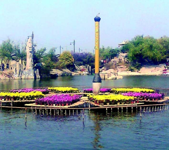 作品描述:公园湖面上,一支巨大的“毛笔”竖立在菊花丛中,好一幅妙“笔”生花图。