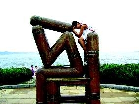 作品描述:公园里的一座木雕呈思考状,这名男生坐在上面也在思考。