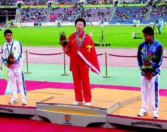 15日,在广州奥体中心场进行的亚残运会田径男子200米-T13决赛中,东营职业学院的残疾学生袁义志夺得金牌,实现了东营市残疾人亚运会奖牌零的突破,上图为袁义志获奖后与教练的合影,右图为袁义志站在领奖台上。 本报见习记者 李沙娜 本报通讯员 刘志刚 摄影报道