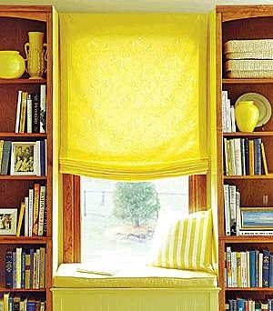 有时一面平淡无味的窗会成为我们装修时的眼中钉,夹在书架之间的窗户虽能欣赏到屋外的风景,却让这个空隙显得平淡。不如装点上黄色的罗马帘,让光线映在色彩亮丽的帘子上,光也因此更加明艳。