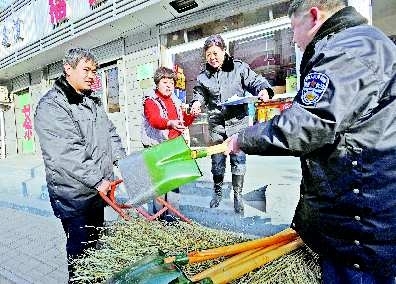 16日,办事处工作人员在分发清雪除冰工具。槐荫区青年公园街道办事处购买300余套铁锨、大扫把等除雪工具,分发给辖区居委会、驻区单位和沿街商铺,以确保降雪应急处置,扫好自己的门前雪。本报记者 张中通讯员修竹 摄