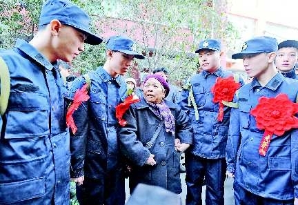 12月16日,济南火车站,76岁的王玉玲迈着颤巍巍的脚步,赶来送别自己17岁的四胞胎孙子孙长宇、孙长峰、孙长岭和孙长涛,嘱咐他们在部队好好干,早日立功受奖。