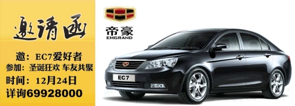 圣诞狂欢 车友共聚12月24日帝豪车友共聚联欢活动正式启动,现募集众多帝豪汽车爱好者及老朋友前来参加,现场为您准备了丰富大奖,还有圣诞特供车型供您选择。