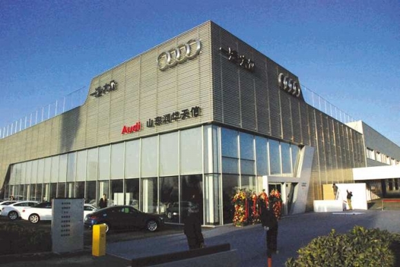 山东润华天信奥迪全新“奥迪城市展厅”,占地面积11185平方米。整个展厅“全铝外墙”与独特的三维立体设计将使整个建筑呈现出一种透明的效果。同时在车间二楼屋面设立停车区,投资规模近亿元。其内部设计更是秉承奥迪“追求卓越服务、品质尽善尽美”的理念,从整体布局到具体细节,无不彰显奥迪尊贵的优质服务。