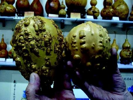 在没有规律的“瘤子”上找出规律,将杂乱无章的凸起,连贯成一幅象征意义明确的美术作品,似乎有点异想天开。“只要一有时间,就会拿出来琢磨,想象它们的形态创作成什么更合适。”葛懋新说,就连睡觉、吃饭时,他也会忍不出掏出来看看,与家人交谈时,也总是不知不觉地将话题往葫芦上扯。无论看到什么图形,总是往自己的“葫芦瘤”上摆一摆,看看是否合适,着实有些“走火入魔”了。