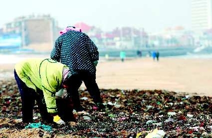 16日,烟台市第一海水浴场附近,部分市民正在拾取海毛菜。连日来的海上狂风将生活在海底的大量海毛菜卷上岸,这种海毛菜晾干后可卖到30多元一斤,一位前来拾菜的市民告诉记者,来这拾菜的人不单纯为了这点钱,更主要是为了图个乐呵。