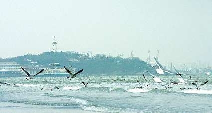 16日下午,烟台市区结束了持续多日的风雪天气,开始转晴变暖,近百只海鸥在滨海景区低飞戏水。