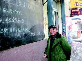 退休之后的第三年,也就是1996年,厚安社区的王文山老人就开始为社区写黑板报,这一写就是14年。他写黑板报没有报酬,他说这是他的一个爱好。他不是社区居委会的成员,却一直为社区工作忙活着,16日早上,他还向居委会申请,能不能把黑板重新刷漆,因为快过阳历年了。他已年过七旬,腰上长了骨刺,还患有老寒腿,他说他要一直写到老,能做多少贡献就做多少贡献。