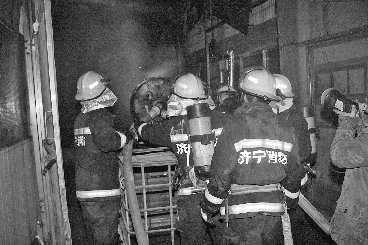 12月15日17时35分,济宁市中区安居镇后埝口村一食品加工厂发生火灾并有大量氨气泄漏。济宁交警支队接警后立即调集任城、特勤两个中队5部消防车、30多名消防官兵火速赶往现场扑救。在起火点数十米外就能闻到强烈的刺鼻性氨气味。起火加工厂的冷藏库正在猛烈燃烧,现场弥漫着大量浓烟。消防战士立即戴上空气呼吸器用6支高压水枪对着火点前后夹击。经过1个多小时的努力,大火被扑灭。由于氨气仍在泄漏,消防战士立即进入冷藏库内侦查,发现至少有3处氨气泄漏点。消防战士在技术人员的帮助下将氨气总阀门关闭,持续对泄漏的氨气进行稀释。这次灭火排氨共用了4个小时。