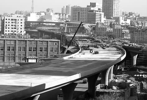 16日,记者从高处俯瞰正在建设中的快速路三期工程,工人正在加紧建设,桥体正在进行箱梁浇筑。按照计划,春节前,东西快速路三期高架桥梁工程主体将完工,春节后将进行东西快速路三期与一期的对接工程。