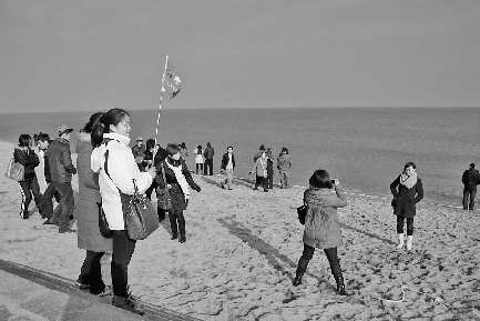 12月16日,在万平口海水浴场,游人众多。当日,气温回升,日照市区最高气温6℃,不少市民出行游玩。