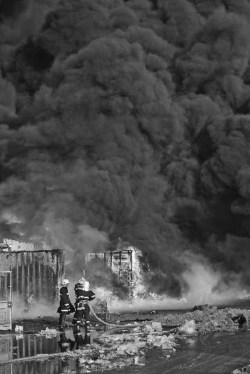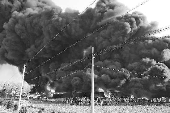 下午2时许,记者来到火灾现场,浓浓的黑烟冲天而起,火借风势蹿起20多米高,燃烧的塑料薄膜吱吱作响,处在下风向的居民可以闻到很浓的刺鼻气味;临近火场,可以感觉到高温热浪阵阵袭来。