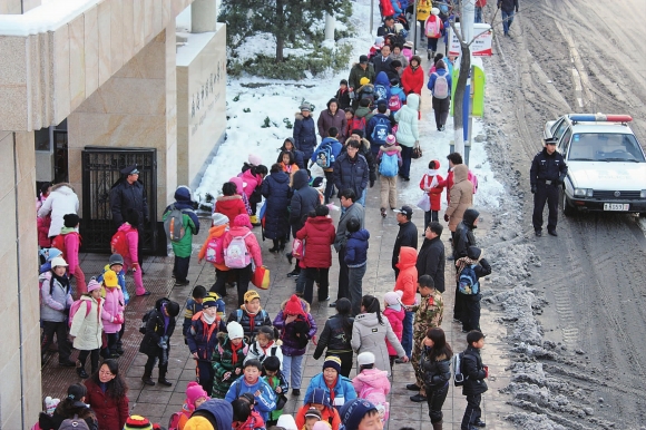 16日下午3点多,鲸园小学门口已经聚集了大批来接孩子放学的家长,比平时的人多了不少。一些家长表示,下雪后路很湿滑,所以特意赶来接孩子回家。