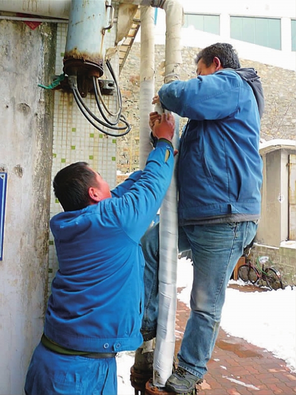 12月16日,南昌街一处楼道的供暖管道发生漏水事故,热电厂工作人员陈师傅接到北仓社区工作人员求助电话后,5分钟内赶到了漏水现场。图为陈师傅和同事更换新的供热水管后,给供热管包裹保温层。 本报记者 吕修全 摄影报道