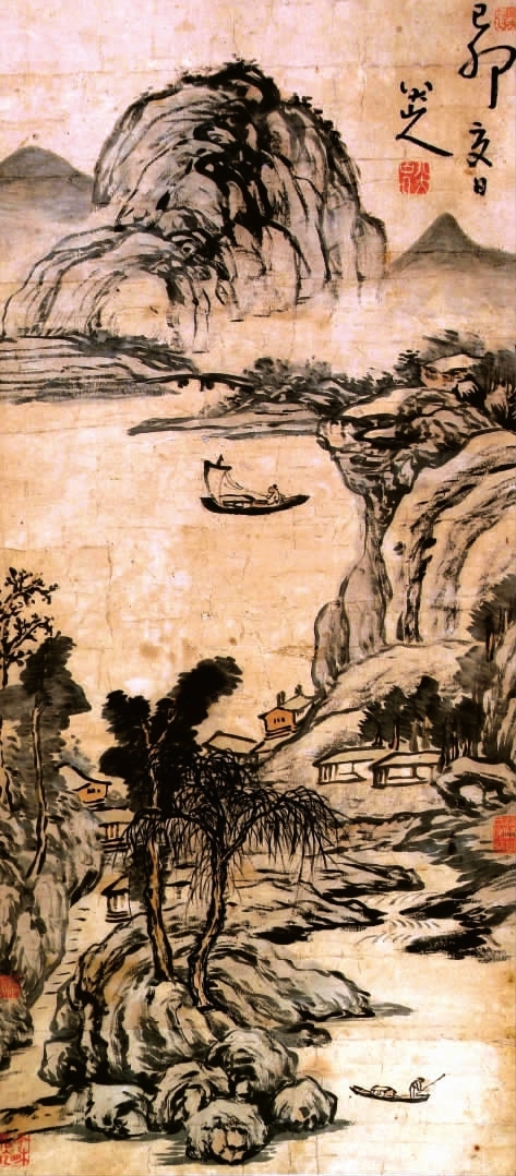 (二)据悉,近日,千万级八大山人作品《居游山水图》将身现山东艺拍市场,这幅《居游山水图》作于1699年,同为八大山人晚年时期风格的代表品。《居游山水图》为立轴中堂,宽43cm,高约119cm,以墨笔作于明代灰纸之上。款题已卯夏日写。八大山人。下钤“八大山人(白)”;左下角又钤“可得神仙(朱)”“个相如吃(朱)”。在画幅的右下角,有一方收藏印,为江陵邓氏家藏(清代)。构图取远山近水之势,意境悠远,上有老翁扬帆游弋,下有老叟坐船垂钓,天高水长,遥相互映;中间实景相对,房舍依稀,恍若有万顷碧波之中,却人烟空旷。全图巧妙取势,浑然一体,构思巧妙,咫尺之间,意象萧远。