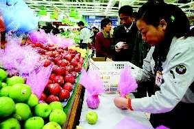 19日,在潍坊市佳乐家超市内,工作人员正在为顾客包装苹果。随着圣诞节的临近,圣诞节吃的平安果也越来越俏销,销售人员介绍,往年的时候平安果也就是苹果主要是年轻人购买,因为送平安果有送平安的意思,所以今年有很多家长为孩子购买,为的是图个吉利。目前每天能卖出近千个平安果。