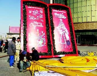 圣诞节即将到来,19日,记者在大学路附近一家大型超市看到,两个大红色的圣诞宣传牌正在安装布置,以吸引更多的顾客前来购物。