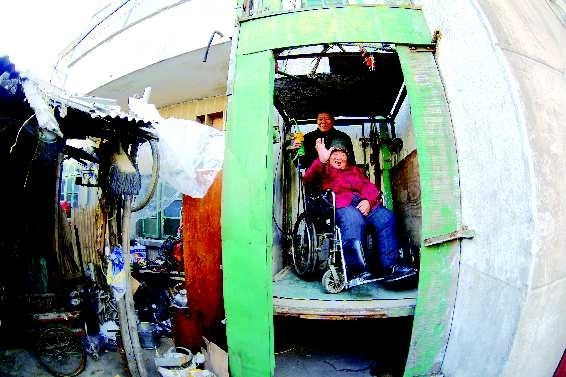 20日,临沂市兰山区的王忠玉推着偏瘫的老伴卓保兰,乘坐自制的电梯下楼。卓保兰因病长时间下不了楼,69岁的王忠玉苦心钻研三个月,花2000多元自制了这部简陋的电梯,方便老伴下楼透风,他也因此被网友亲切地称为“电梯爸爸”。 本报记者 马峰 摄