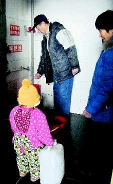 “没办法,家里没水,只能去轻纺城一楼的卫生间里打水。”87岁的耿老太颤巍巍地提着装满水的水桶,无奈地说道。居民向记者介绍,健民路宿舍共有136户居民,今年供暖开始后,居民们突然发现,家里的自来水变成了热水,最高温能达到50℃,一周前干脆停水了。