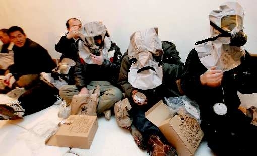 韩国实弹训练期间,当地居民头戴面具在掩体中躲避。