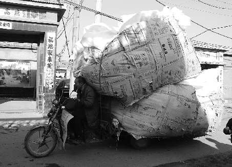 大图:12月20日,一辆装着两大包货物的机动三轮车经过张屋村一条窄窄的胡同,行人见到纷纷让路,以防被车上的大包袱撞到。