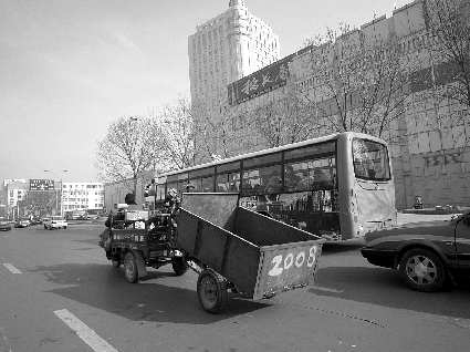 小图:20日11时许,西四路上,一位司机驾驶一辆三轮摩托车拖着另一辆三轮摩托车,过往车辆唯恐避之不及。