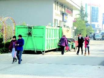 市民刘阿姨告诉记者,这两个垃圾箱放在这儿有十几天了,“太影响形象了,就在护城河边,而且后边是个小广场,被两个垃圾箱挡了个严严实实。而且这里交通这么繁忙,尤其是到上下班时间,电动车、自行车呼呼地蹿,还得绕着走,总是提心吊胆。”