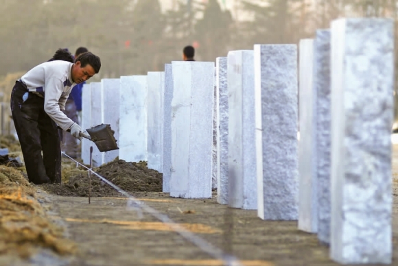 12月20日下午,在汇泉广场,工人师傅正在文登路两侧的临时道路上安装路基石。据工程监理朱师傅介绍,为了地铁一期M3号线汇泉广场站的建设,文登路将封闭施工,封闭期间,将在文登路两侧开辟两条400米的临时道路,进行交通疏解,缓解地铁施工带来的交通压力。预计,12月底两条调流线将修建完成。 本报记者 张晓鹏 摄