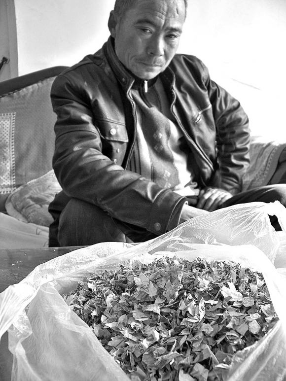 在薛培德家里,记者问其家中是不是有现金被老鼠咬坏一事,薛培德随手指了指放在长条矶上的一包物品说:“那,在那放着呢。”记者看到,一只普通型号的白色塑料袋,装着一包碎屑,最大的也只有指甲盖大小。如果不是碎屑上印着残缺的诸如“银”或者半块“1”字,记者很难相信眼前这包碎屑曾经是一张一张的百元大钞。