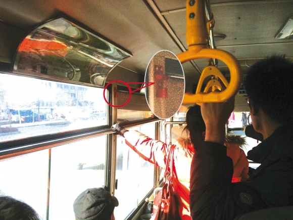 12月20日上午,记者乘坐6路公交车时,发现车内共有三个安放安全锤的位置。但车身前半部分的一个安全锤已经没了踪影,只剩下卡座。