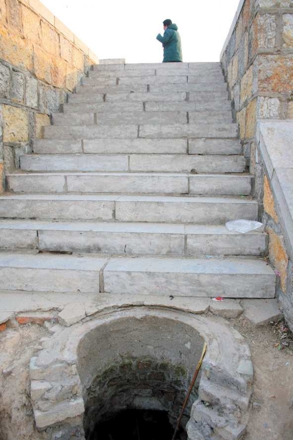 东升桥附近,通向东昌湖湖岸的台阶最底层的一个下水道,井盖被扔在1米开外。20日,附近居民介绍,井盖已坏了很长时间,附近有学校,过往学生比较多,让人提心吊胆。本报记者 邹俊美 摄