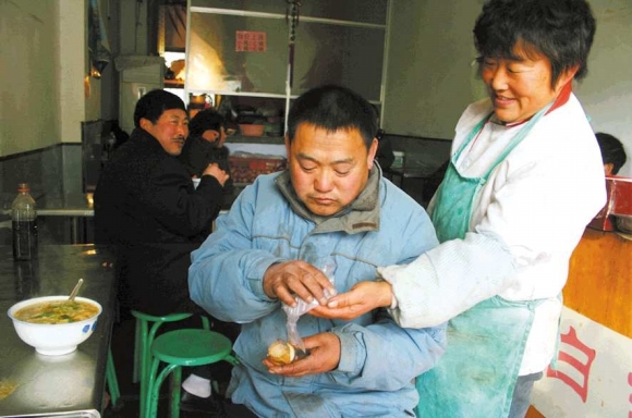在糁汤店里,苏女士给河儿拿了个鸡蛋,端了碗糁汤说:“河儿,吃饭!”河儿大口吃着,胖乎乎的脸上露着满足、单纯的笑容。