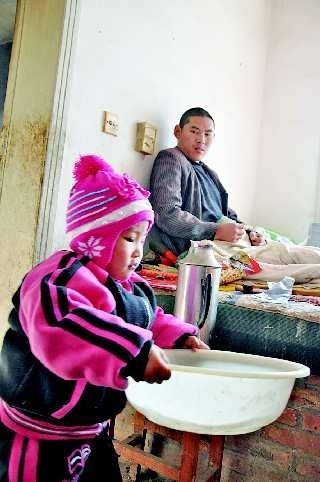 12月19日中午,网友们来看望董建设。身高不足1米、寡言少语的董心怡见到陌生人始终一言不发,只是在董建设的吩咐下,穿梭于拥挤的人群中,先找来脸盆放在炕上爸爸能够得着的地方,手握一个大瓷缸,一缸缸地从外屋的水缸中舀水,然后倒进炕上的脸盆,再兑上开水,并爬上凳子,取下毛巾递给爸爸。这些事情做下来,小心怡只需要一分钟。