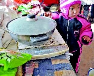 图片说明:①②:小心怡帮爸爸打水洗脸。③几包方便面就是父女俩的午餐。