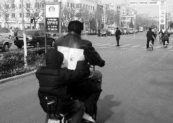 12月20日,在德州德兴大道上一放学的孩子靠在父亲的后背上看起书来,行路读书两不误。不过,如此看书,对小朋友的眼睛有害无益。