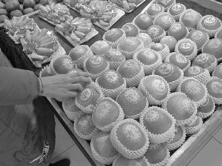 据销售人员介绍,苹果果皮变红需要光线的照射,在苹果由青色快变成红色时,照着自己想要的字符贴上不透明的贴纸,待苹果成熟时,苹果表面即可长成想要的样子。“不会对苹果的味道产生影响。”销售人员说。