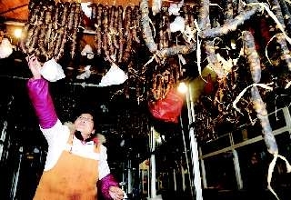 12月19日,在烟台市文化路农贸市场迟女士正在悬挂香肠。据了解,虽然最近香肠价格增长了10%左右,但销量依然持续增长。迟女士讲,与往年同期相比,她这一个摊位每天就能多卖100多斤。